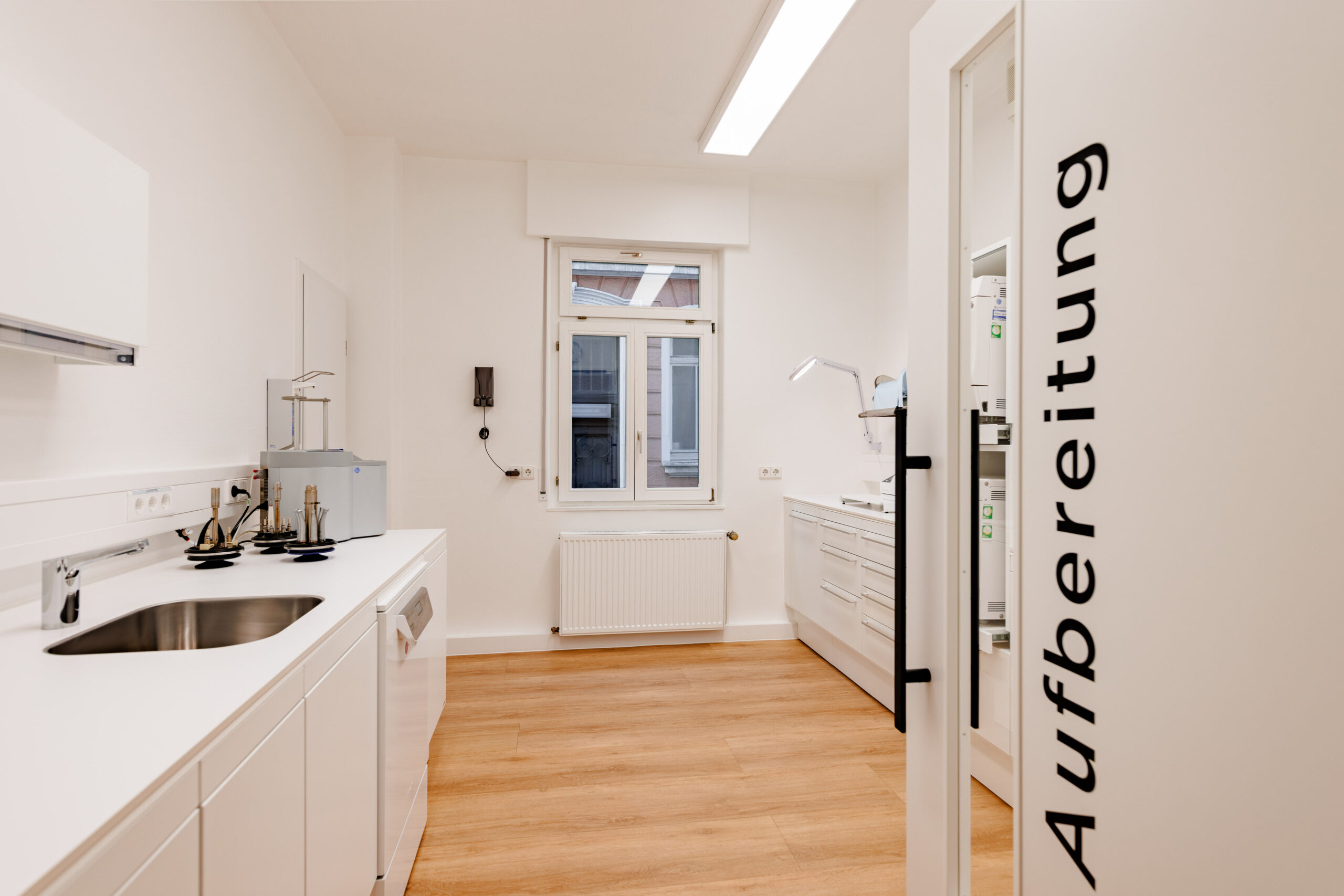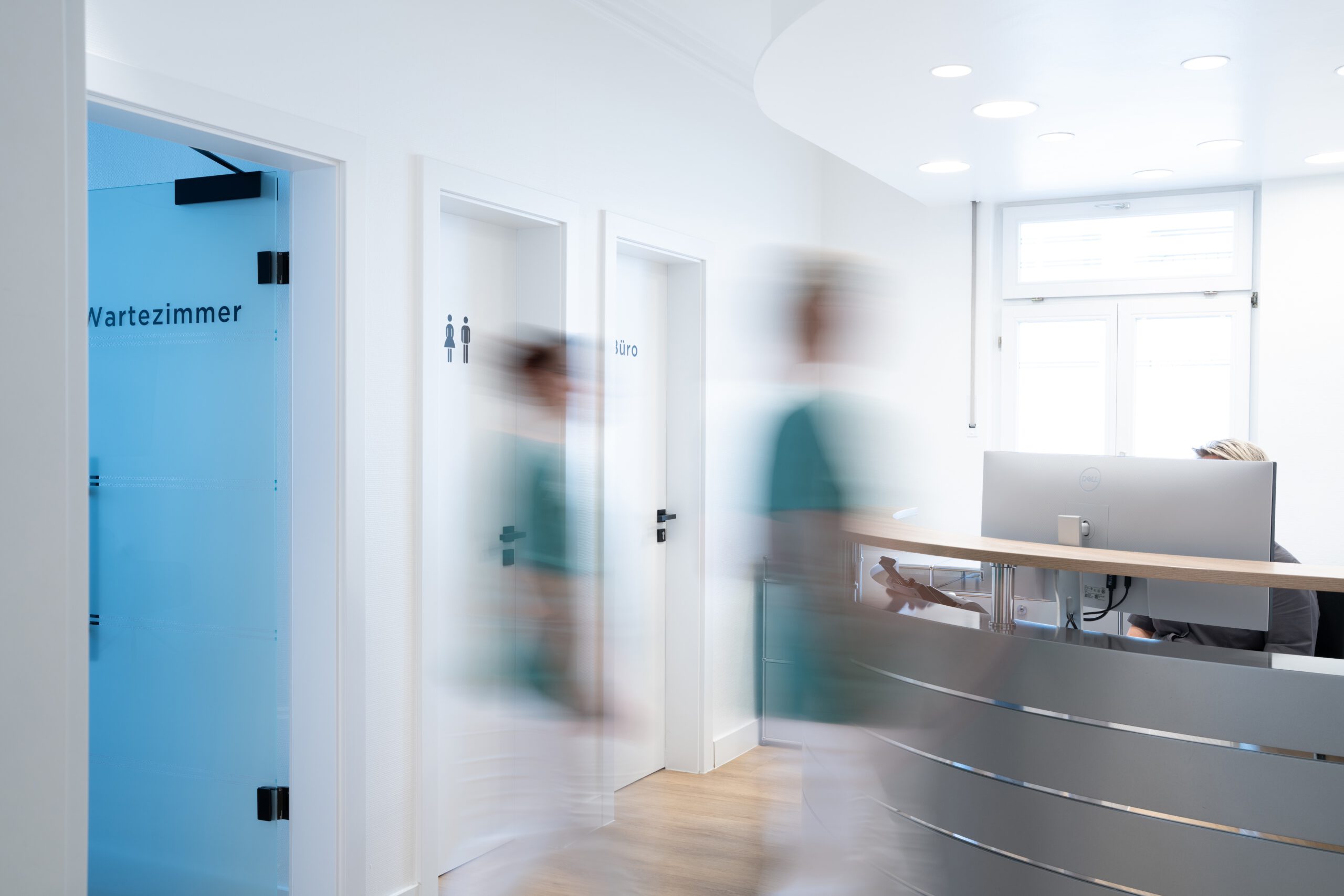 In Schwäbisch Gmünd bauten wir 2021 eine bestehende Zahnarztpraxis um. Bei diesem Projekt kam es auf eine enge Zusammenarbeit mit den Handwerkern aus den anderen Gewerken an, da der Umbau innerhalb des einwöchigen Betriebsurlaubes der Praxis realisiert wurde, um auf eine längere Schließung zu verzichten. Die Praxis wurde durch den Rückbau und die Errichtung von nicht tragenden Trockenbauwänden umstrukturiert. Die bestehenden Fliesen wurden von uns durch einen Fließestrich ausgeglichen und darauf in der gesamten Praxis ein Vinyl-Boden in Holzoptik verlegt. Des weiteren führten wir die Tapezierarbeiten und Malerarbeiten aus.